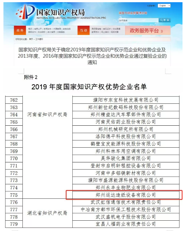 2019年12月,國家知識產(chǎn)權(quán)局公布2019年度國家知識產(chǎn)權(quán)示范企業(yè)和優(yōu)勢企業(yè)名單,鄭州運達造紙設(shè)備有限公司榜上有名。