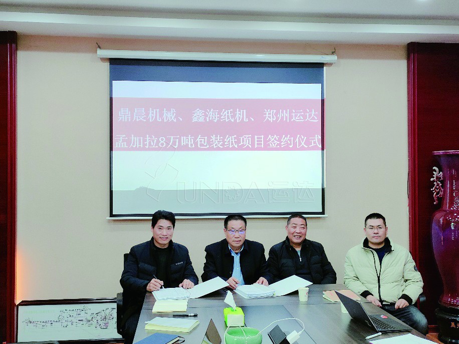 由鼎晨機(jī)械、鑫海紙機(jī)和鄭州運(yùn)達(dá)三方合作,孟加拉國(guó)8萬(wàn)噸箱板紙項(xiàng)目正式簽約——運(yùn)達(dá)國(guó)際業(yè)務(wù)部2021年牛年迎來開門紅。